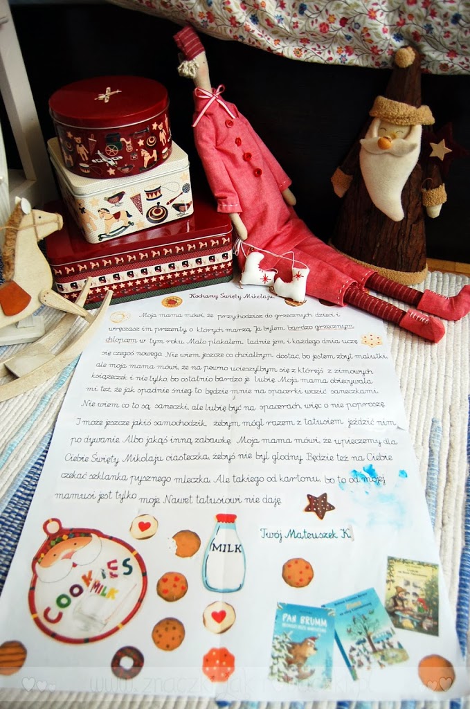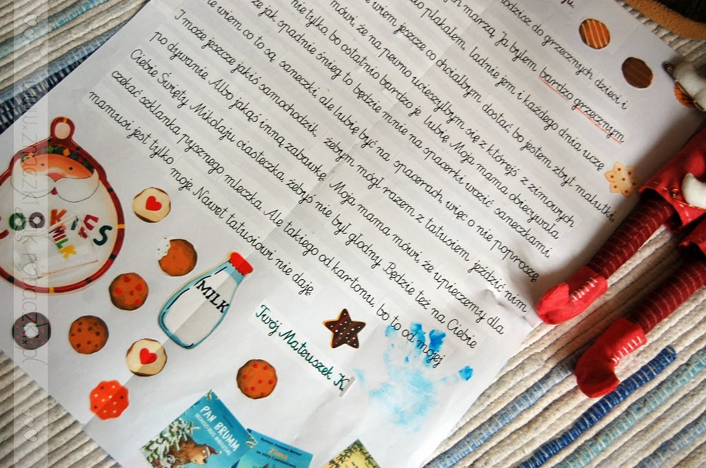 Miałam masę frajdy przy jego tworzeniu. Mój mąż tylko spoglądał na mnie spod oka, gdy wycinałam i kleiłam papierowe elementy. List został podpisany przez Mateuszka, a następnie wysłany do Mikołaja. (tak naprawdę docelowo powędrował do naszego dzienniczka-pamiętniczka ze skarbami- będzie nam kiedyś przypominał o tym dniu).