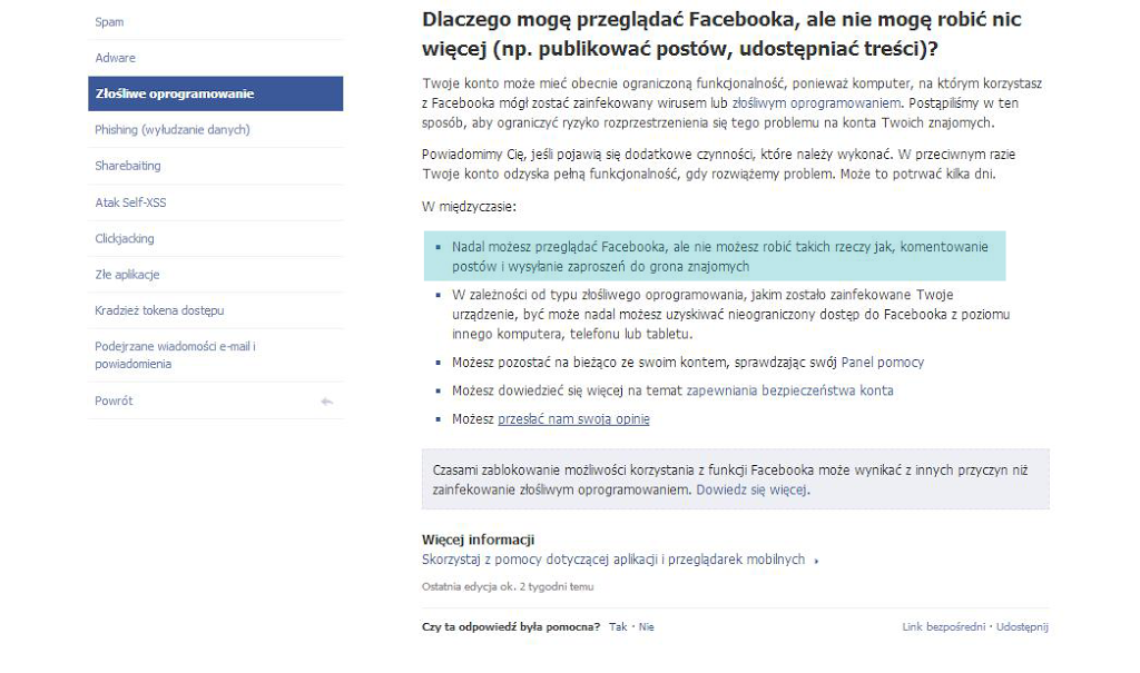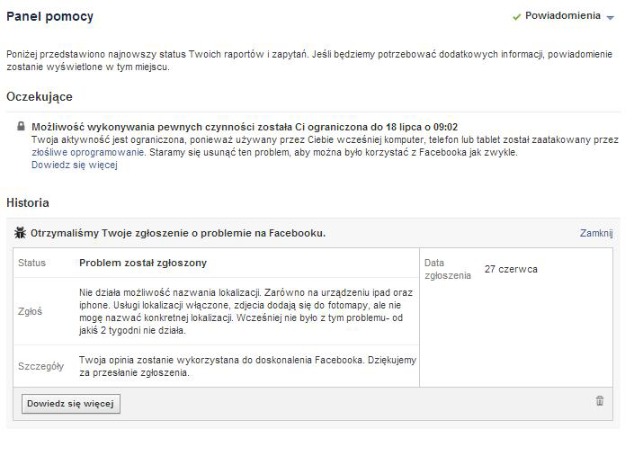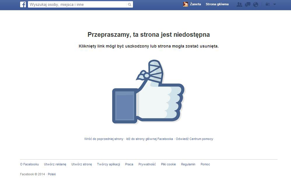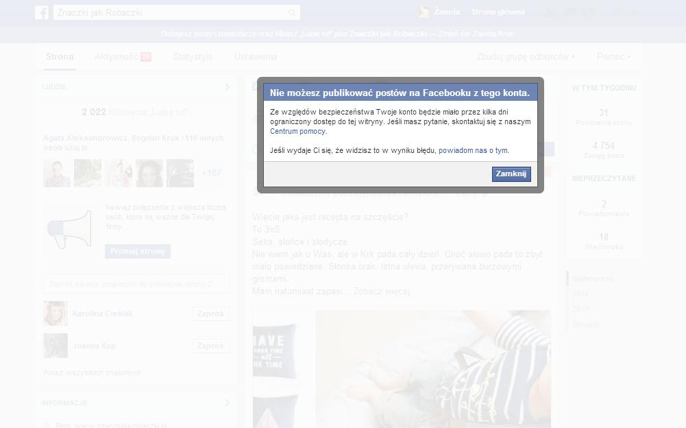 Minęły dwa tygodnie, ja już dawno zapomniałam o zgłoszeniu. Aż do momentu, w którym próbuję dodać post na moim fanpage. Wyskakuje mi komunikat.