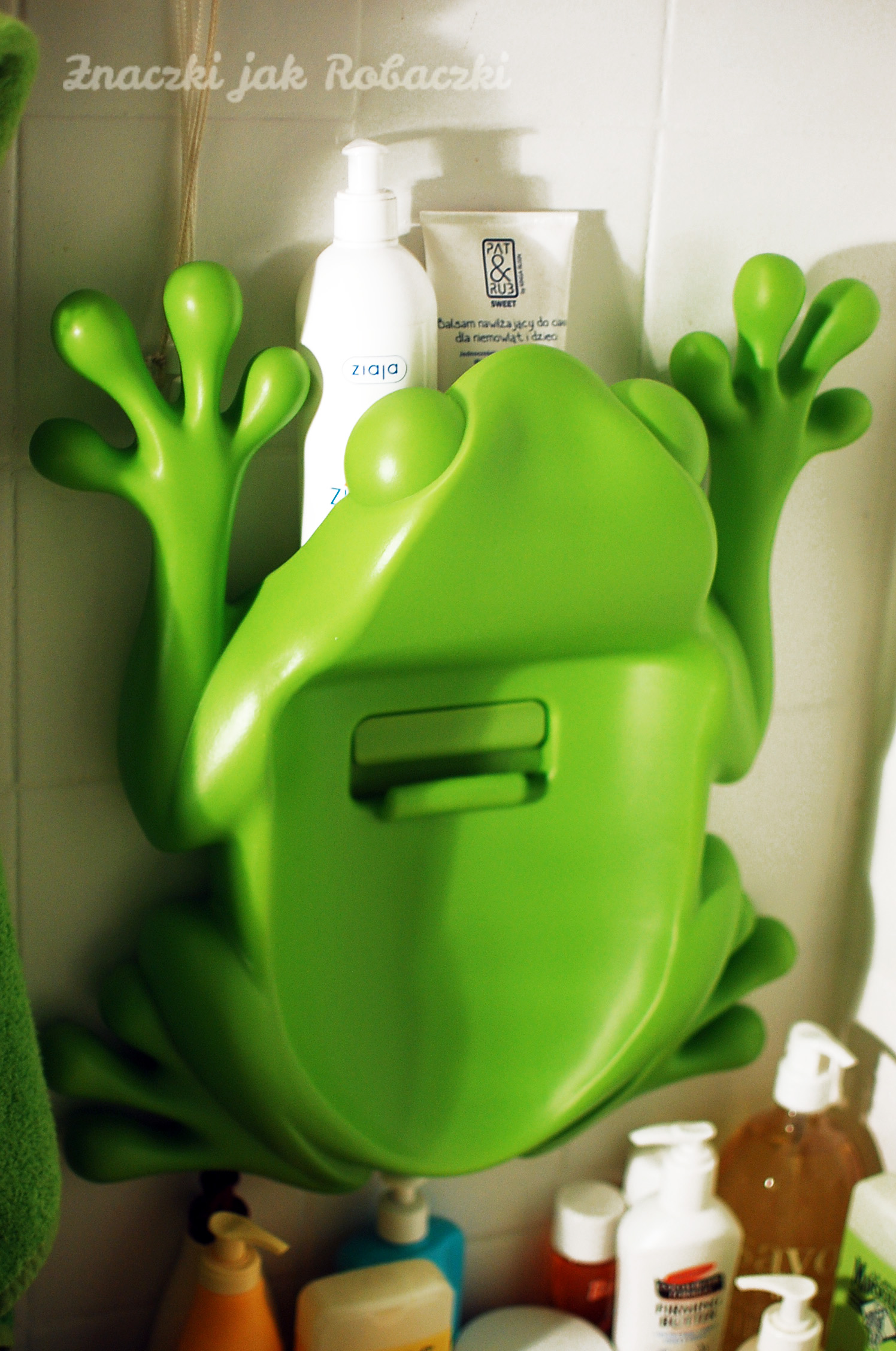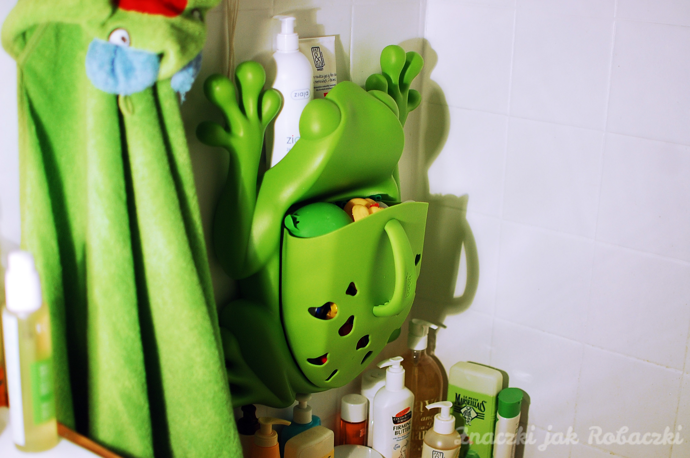 Do tej pory po każdej kąpieli lądowały w pustej wanience na „suszeniu”, co dawało efekt małego nieładu i powodowało, że za każdym razem chcąc np przeprać coś na szybko w wannie musiałam je gdzieś odkładać. Dlatego z otwartymi ramionami przyjęłam Ziabula. Ziabul to nowy przyjaciel Młodego, który przycupnął na płytkach nad wanną. Skrył się tam trochę cichaczem, nie zajmuje dużo miejsca, za to świetnie sprawdza się w roli organizera. Mieści w sobie sporo zabawek, które bez wyciągania możemy opłukać pod bieżącą wodą. Genialny pomysł, mówię mam.