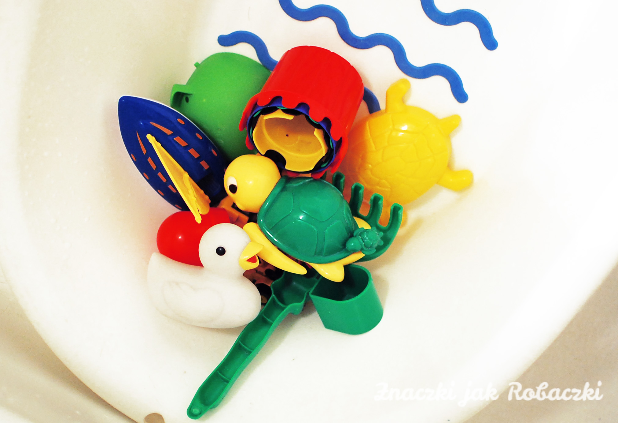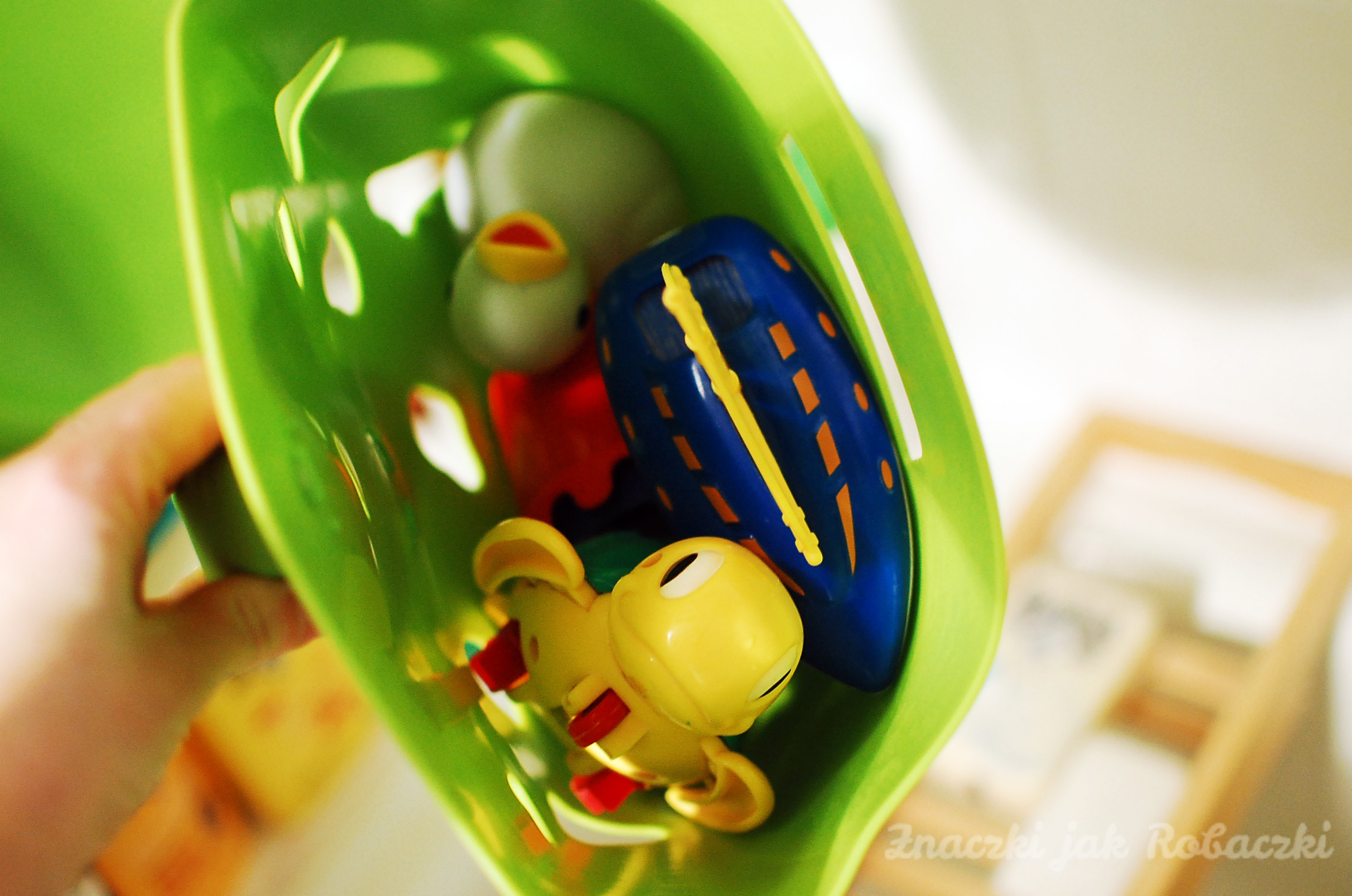 Nasza łazienka ma jakieś 4 m2 i poza wanną, umywalką, ubikacją, pralką i różnego rodzaju szafkami musi pomieścić także wanienkę Matiego (mimo, że mój dwulatek kąpie się już w dużej wannie to od czasu do czasu ma kaprys kąpieli w wanience) i jego zabawki kąpielowe. Zabawki jak wiadomo są niezbędne, aby wieczorne pluskanie należało do przyjemności. Muszą też być w zasięgu małych rączek.
